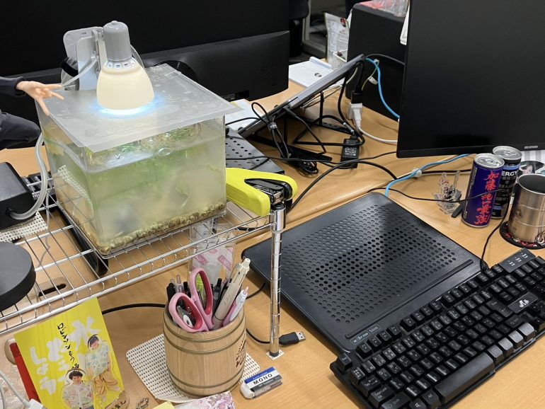 フィギュアやアクスタを飾っている検査員は多いのですが、まさかデスク上でエビを飼育している人がいるとは…。